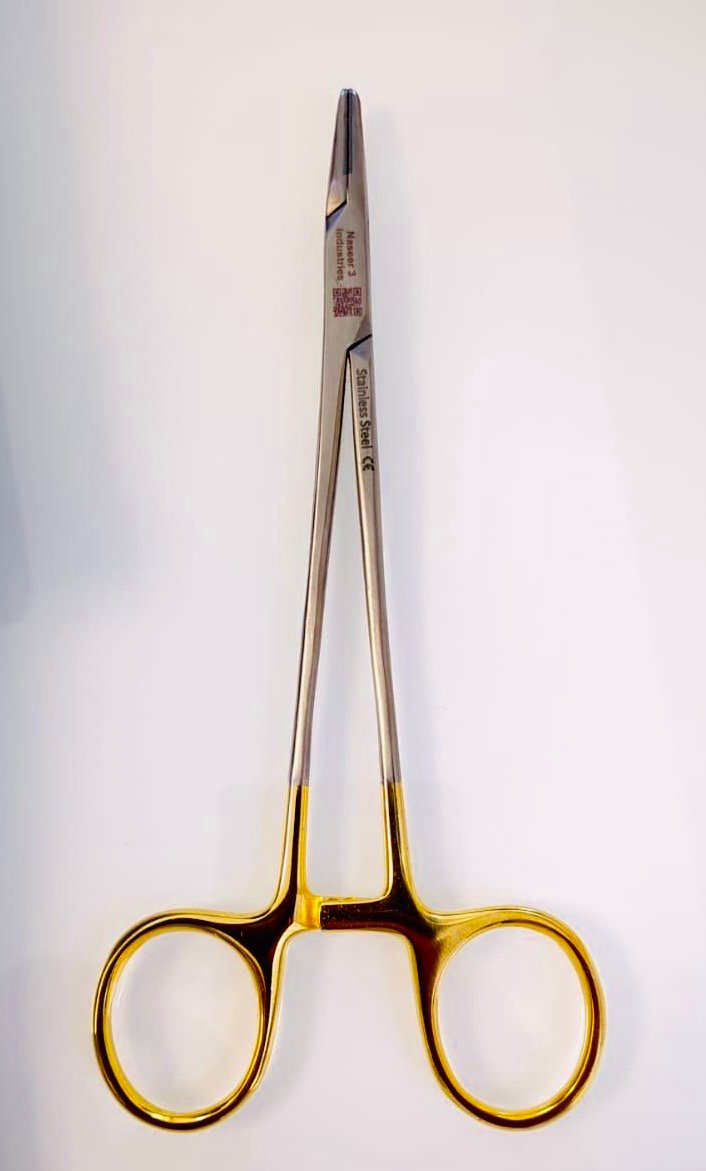 - Jaws: Short, sturdy, and typically textured with serrations or cross-hatching to provide a firm, slip-resistant grip on the needle.